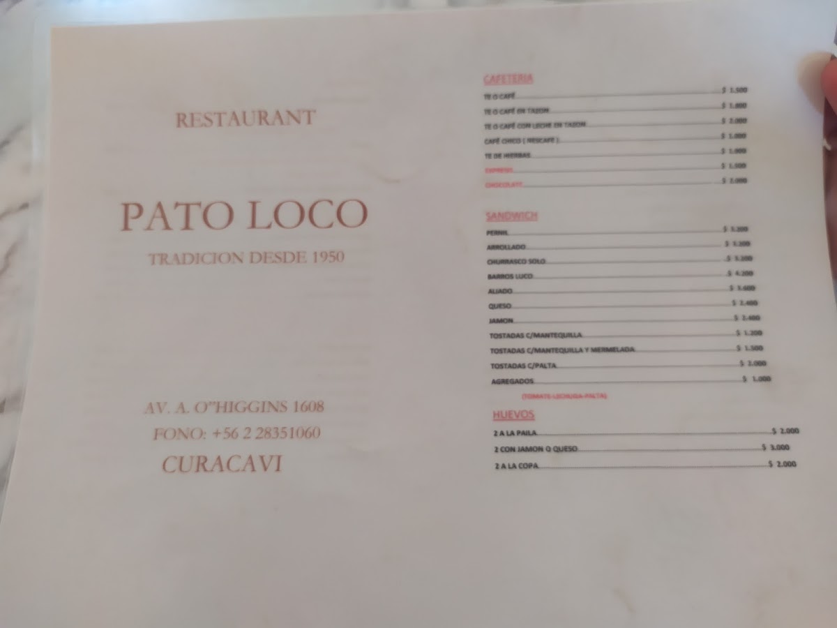 Introducing the menu at Restaurante Pato Loco, located in Curacaví, Chile, where homestyle cooking meets warm hospitality. This charming restaurant has garnered rave reviews from patrons who praise its abundant and delicious offerings, making it a must-visit destination for food lovers.